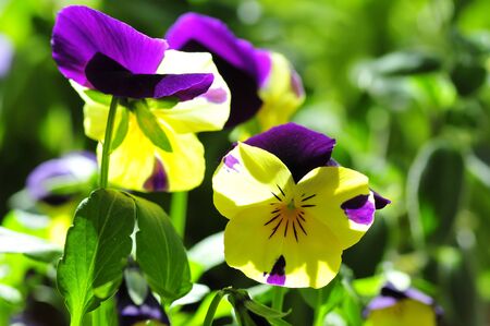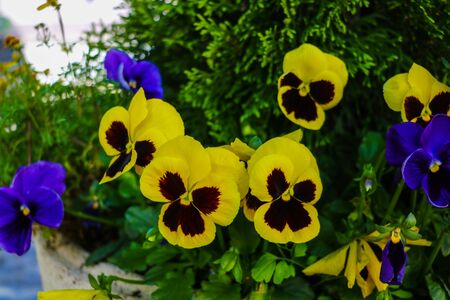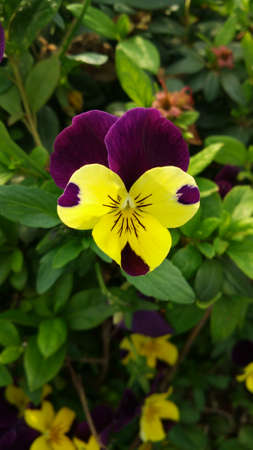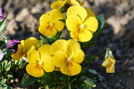Blooming season of violets in the garden. The violet flower is yellow with purple color.