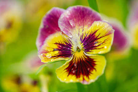 Colorful viola tricolor flowers in garden with drops
