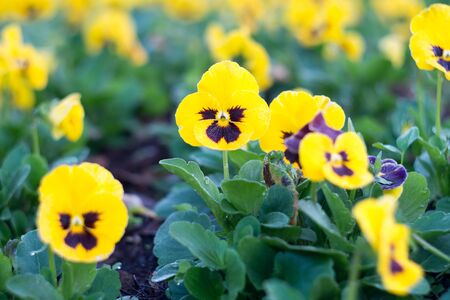 Yellow pansy flowers in the bed flower