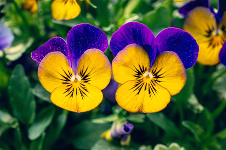 Macro view of yellow-blue pansy flowers on a sunny spring day.