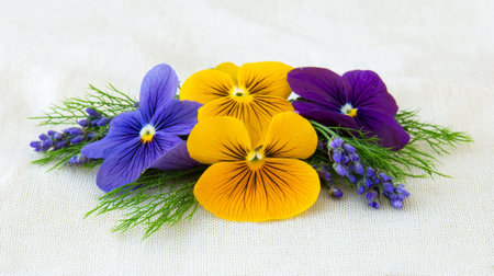 Vibrant Pansy and Lavender Floral Arrangement on White Fabric. Concept of Nature's Beauty, Colorful Botany Display. Purim.