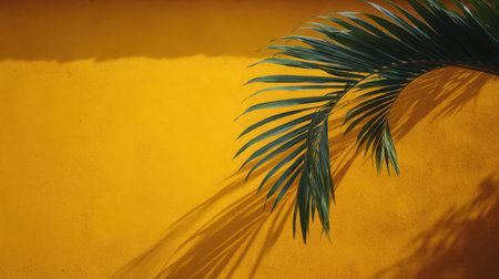 A stunning tropical palm leaf casts a delicate shadow over a bright yellow wall, merging natural beauty with vibrant color. Perfect for decorative and artistic themes.