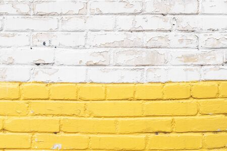 Yellow and white brick wall texture background. Old weathered and cracked bricks close up. Copy space