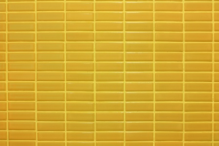 A close-up view of a wall covered in bright, glossy yellow ceramic tiles. The tiles are arranged in a neat grid with dark grout lines, showing a reflective, glazed surface.