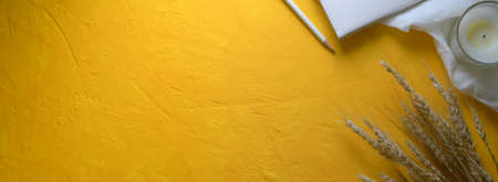 Top view of creative workspace with stationery, candle, decorations and copy space on yellow concrete background
