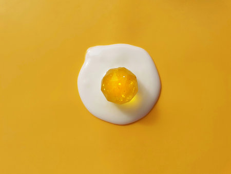 Cream liquid gel serum flows down on yellow texture, makeup and cosmetics background, skincare or hair product