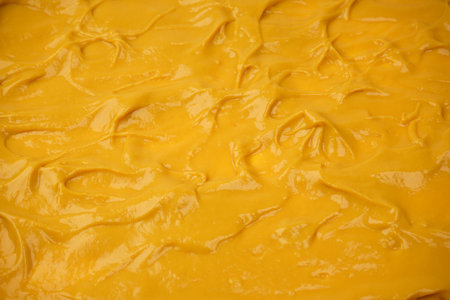 White yellow caramel mass for preparation of lollipops spread on pastry table. Cooking sweet candy. Handmade sweets. Background of sweet food, candies for holiday, childrens birthday. Extra close up.