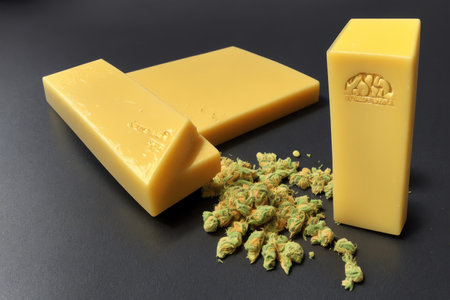 A stack of natural beeswax blocks set against a solid green background, representing organic materials, crafting, and natural products. The image is simple yet detailed, focusing on texture.