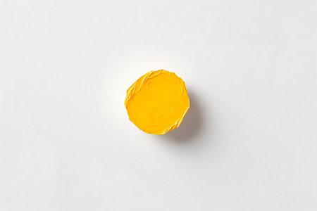 Minimalist composition featuring a vibrant yellow acrylic paint circle on a clean white background, creating a striking contrast and a sense of modern simplicity