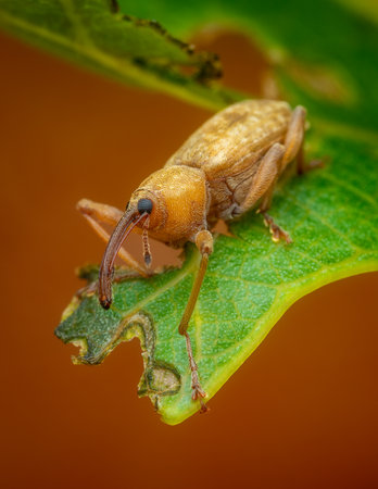 A colorful and close up view of Weevil black eyes sitting on leaf