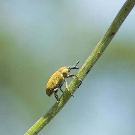 Macro of snouted weevil beetle (Lixus iridis) hidden under tree twig head over heels over blue sky background