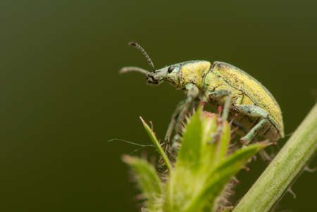 Phyllobius pyri, the Common Leaf Weevil, is a species of broad-nosed weevil belonging to the family Curculionidae subfamily Entiminae. Detail macro view of insect head and eyes.