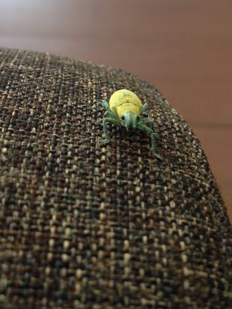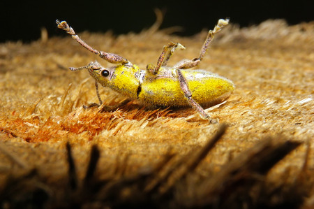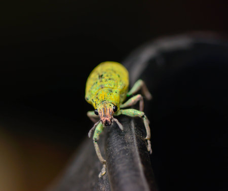 macro of green weevil hanging on black rubber with dark blur background ; selective focus at eye