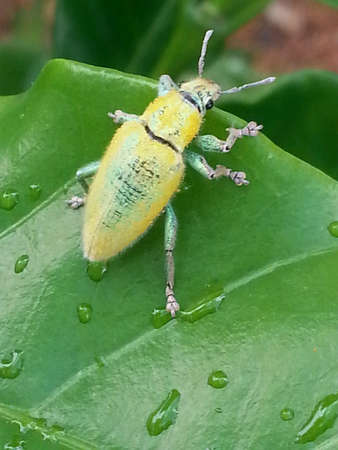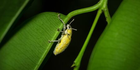 White beetle weevil resting on a green leaf and dew drop in morning, Insect photo in Thailand.