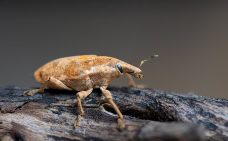 A fascinating brown weevil rests on a rustic log, showing intricate textures and details in soft lighting.