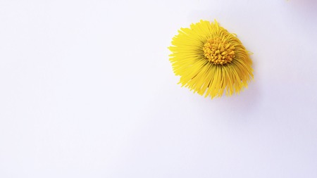 beautiful yellow coltsfoot flower bud isolated with shadow on white background. Tussilago farfara. Used to treat lung diseases such as asthma and cough. Horizontal, copy space