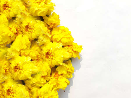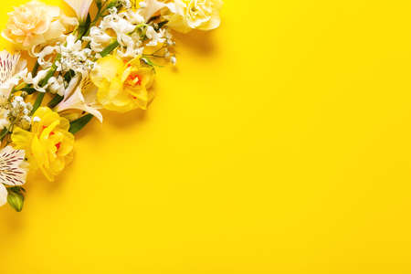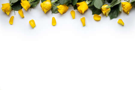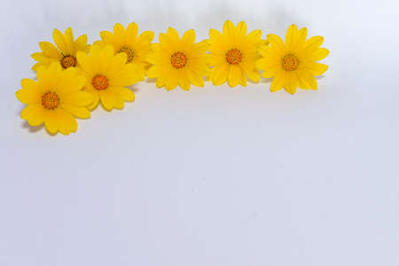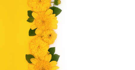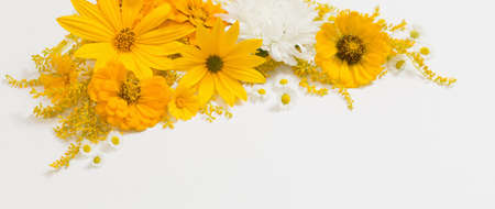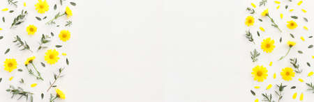 Flowers composition. Yellow flowers on white background. Flat lay, top view, copy space