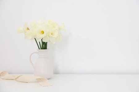 narcissus daffodil inflorescence isolated on white. light floral minimalistic background with copy space for your text wide horizontal landscape format