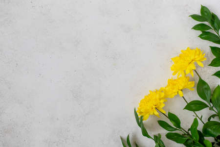 Top view image of yellow chrysanthemum field flowers composition over wooden white background. Flat lay