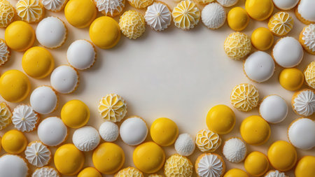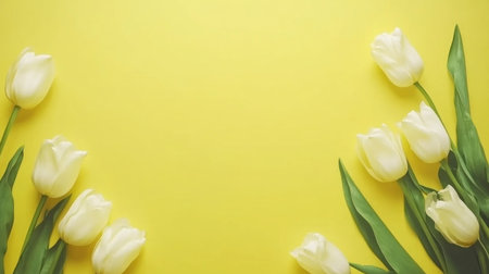 A yellow background with white tulips on the left and right sides, with space in between for text. The flowers should be arranged to form an oval shape at one end of the frame, giving it an elegant feel. There is enough copy space on both side corners for title or body text. On the bottom half of the photo, there's more blank space. This design would work well as a banner or header element for various events like Mother's Day, Women's Day, Valentine's Day party, etc. --chaos 30 --ar 16:9 --v 6.1 Job ID: dd5110bb-2832-4915-8094-3be91406ac70