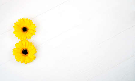 March 8 with two yellow flowers as number eight on white wooden background. International Womens Day. Top view. Copy space