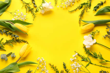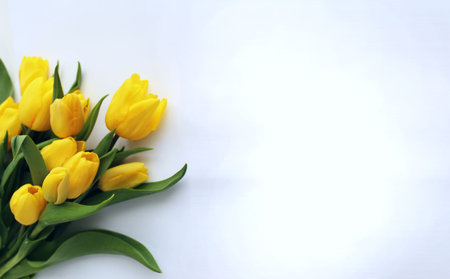 Yellow tulips flowers on yellow background. Mothers Day, Birthday, Valentines Day. Concept of holiday. Symbol of spring. Flat lay, top view, copy space