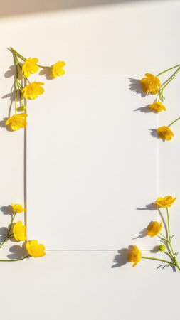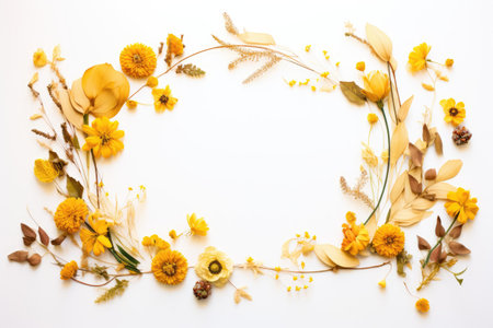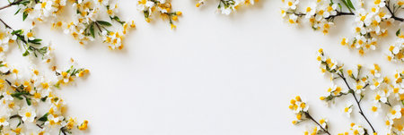 A charming arrangement of wild yellow and white flowers surrounds an empty center, set against a crisp white background, embodying simplicity, freshness, and a clean, natural design, banner