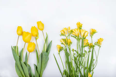 Bouquet of gorgeous yellow tulips and tender graseful freesias ,isolated on white. Source material, sample of spring flowers for your project. Mockup for greeting card.