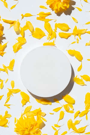 White podium for product presentation on yellow flower petals background. Empty cylindrical platform for cosmetic. Mockup with concrete circle and copy space.