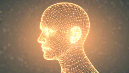 Wireframe digital head without any facial features, hovering over black background, symbolic of artificial intelligence and anonymity, glowing contours