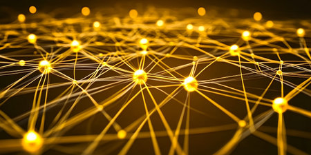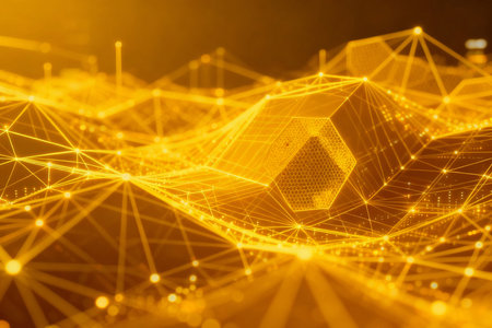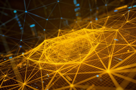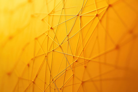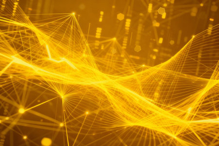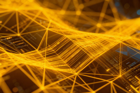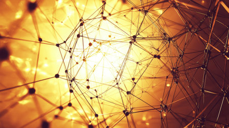 This abstract image features a network structure with interconnected lines and nodes, illuminated by a warm golden light, creating a dynamic and modern aesthetic.