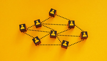 A yellow background with a network of thin black lines connecting small black figures.