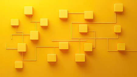 Graphic design featuring a network of yellow square shapes connected by thin lines on a bright yellow background. The image showcases a modern and abstract geometric pattern.