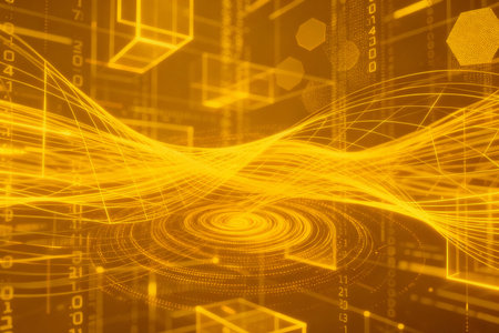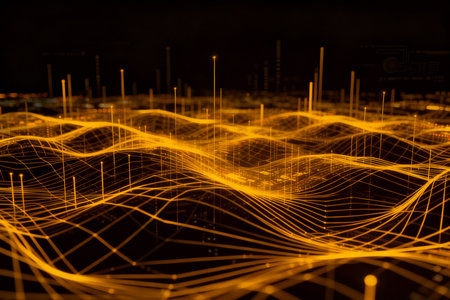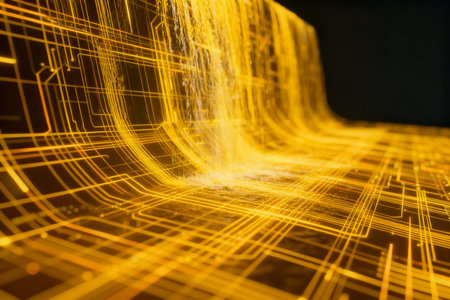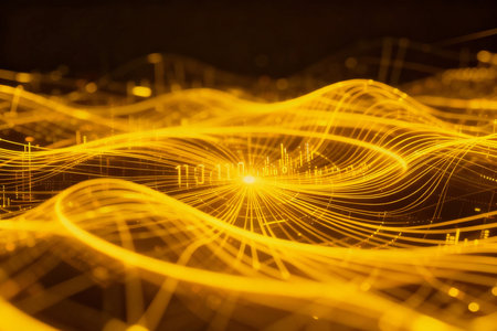 Experience the dynamic flow of information with this mesmerizing abstract digital art. A complex network of golden lights pulsates, symbolizing connectivity, data, and the future of technology.