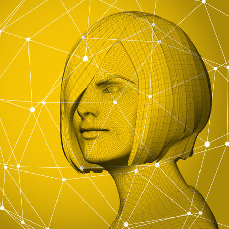 Head of the person from a 3d grid. Human wire head model. 3D geometric face design. Polygonal covering skin. 3D rendering