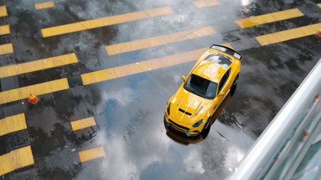 A striking image of a yellow sports car model positioned on a wet urban street with colorful traffic markings, showcasing reflections and intricate details.