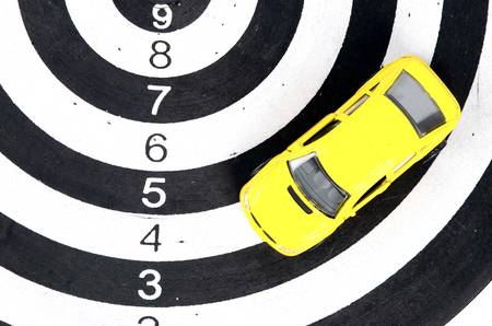 Car rental, trip, travel or weekend activity concept flat lay with yellow small toy cabriolet car on yellow background