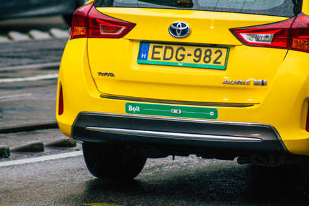 Budapest Hungary july 17, 2020 View of a traditional yellow Hungarian taxi for passengers driving through the streets of Budapest the capital of Hungary