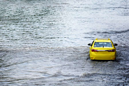 A battered yellow suv rests amid slick wet pavement, streaked with rain, after an urban collision, evoking tension and the consequences of a sudden stop.