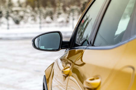 Close-up of the front headlight and wheel of a yellow modern car. Headlight on yellow car, front view, close up. Headlamps of a vehicle. Nobody, street photo