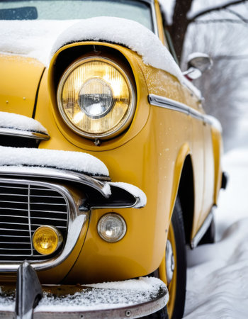 A detailed view highlighting the retro charm of a bright yellow automobile, emphasizing smooth curves and aged metal craftsmanship.