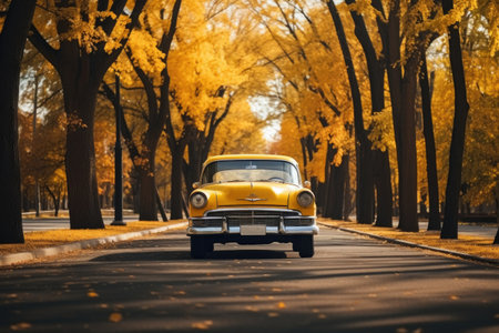Izhevsk, Russia, September 14, 2019. Retro car toy in autumn forest. yellow car in autumn landscape. Fall season concept.