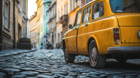 Vintage Yellow Taxi Car Parked on a Cobblestone Street in Historic Urban Setting Capturing Nostalgic Charm and Classic Automobile Design. Concept of Urban Transportation, Taxi Service.