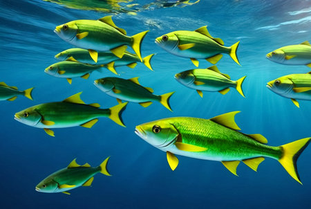 Generative AI : Defocused background Filtered fish green bokeh blurred background
