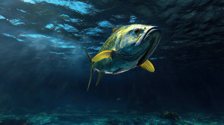 Photo realistic image of a tuna swimming close to the surface of the water. Generative AI illustration.