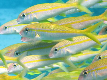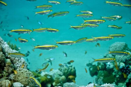 Flock of tropical sea fish Yellowtail fusilier or Caesio cuning in natural ecosystem of marine aquarium.