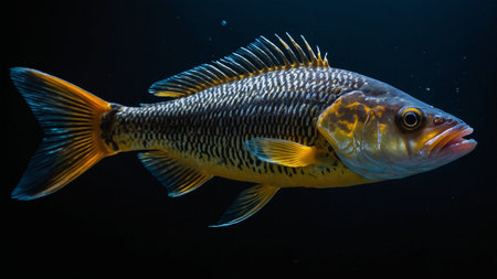 Closeup Of A Golden Dorada Fish Swimming Gracefully In Clear Blue Water. Concept Underwater Marine Life, Graceful Fish Movements, Closeup Nature Photography, Clear Blue Water Beauty.