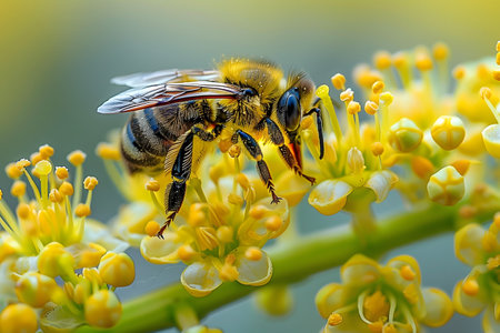 A stunning close-up image showcases a honeybee diligently pollinating bright yellow wildflowers against a soft, blurred background. Perfect for nature enthusiasts.