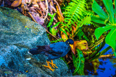 common myna. Black-colored songbird with yellow beak and yellow legs, view from above