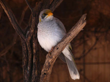 Yellow mask black eyes white and black feather bird staring face on from tree branch on tree bokae background